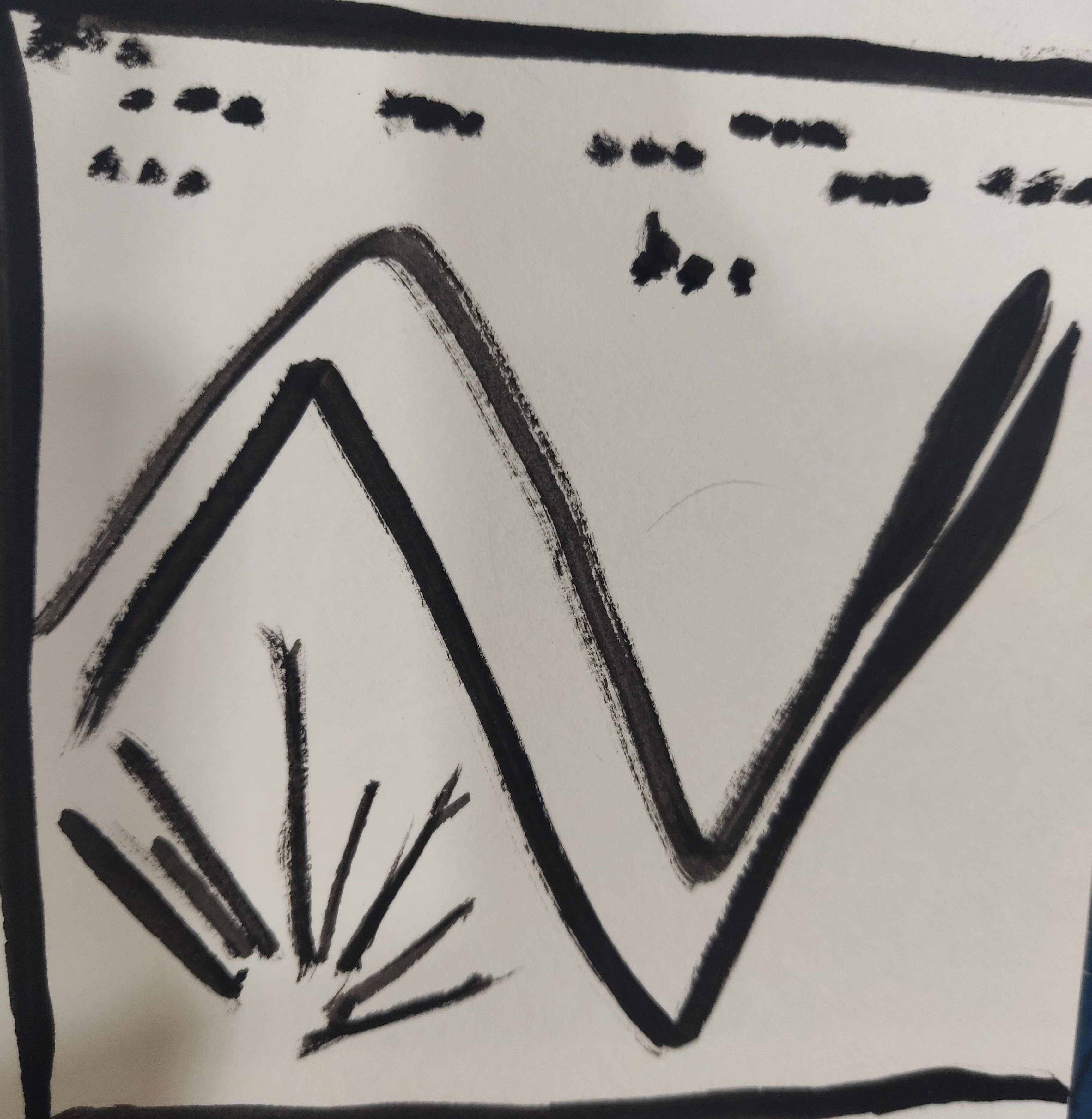 This illustration has has two n lines which portray grasshoppers leg and mountains . The mini three dots at the end shows group of ants . This is inspired from the ant and the grasshopper story where during summers ant work hard and the green creature enjoys whereas in winters ants rest and live in heat where grasshoppers go through a hard time.This is the very much situation that helps me relate to myself and hoping for a good winter in future.