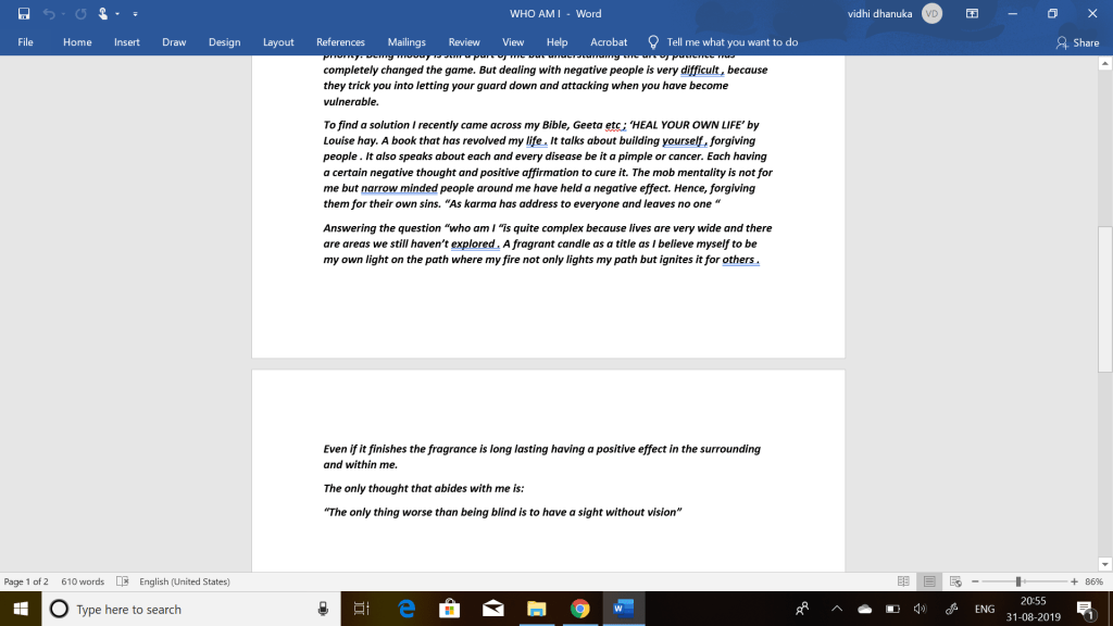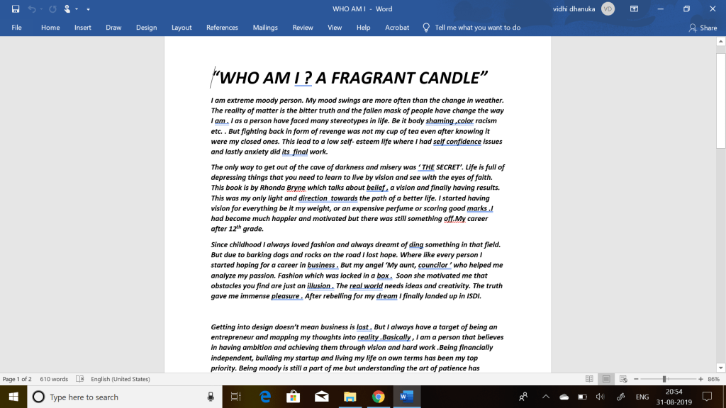 This class was mainly discussing about the final chapter of Metamorphosis . It was mainly about dehumanization, breakthrough , freedom etc. This book spoke about 19th century where prestige was uttmost of importance. The final chapter declared the death of Gregor Samsa who died as a creature. It is the point where he could be at peace after death . As life never gave him calmness , happiness etc. But now he could rest . This book had quite a diplomatic ending which is terrifying yet justifying. This book was rich in vocabulary and perfect usage of metaphors which inspires us from a designing point of view. Next we discussed the ‘Who Am I ‘ assignment where we had to describe our self in 20 words or phrases. Connecting activity was given from the assignment where we have to take 2 or 3 traits and write an essay about 500 to 600 words .