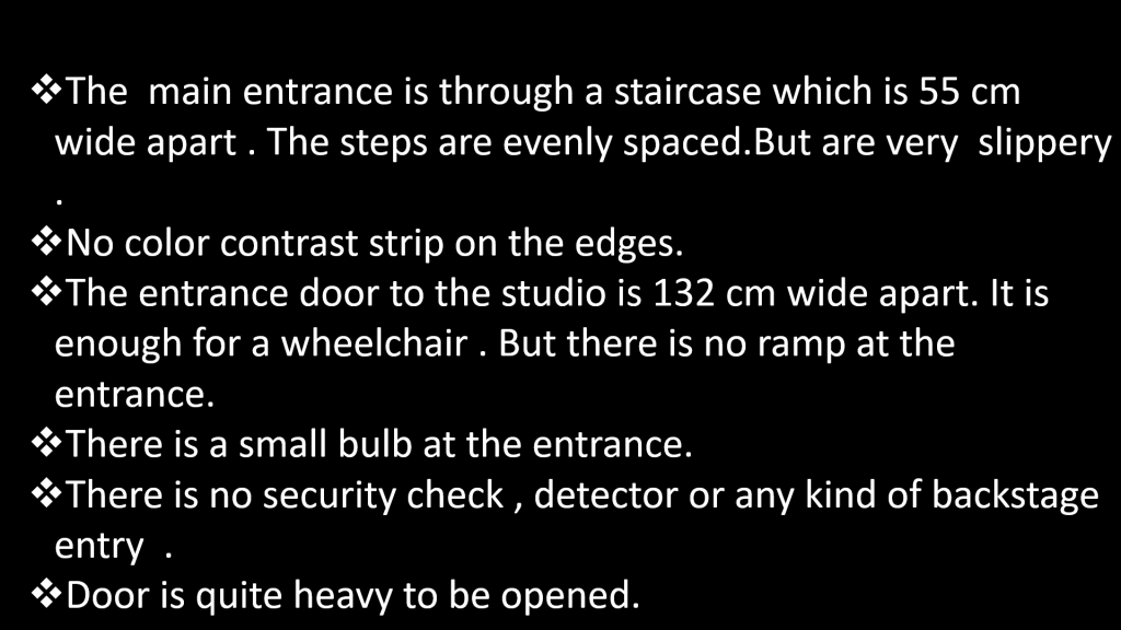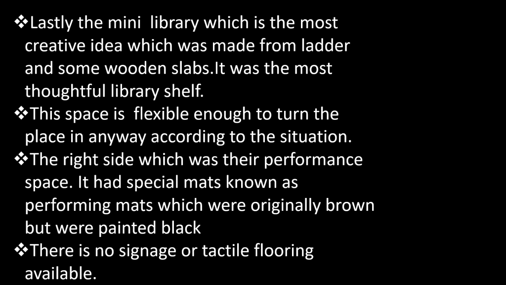 Lastly the class ended with presenting our assignment from last class. Where we had to visit a different site from last time. First i visited a library and now a performance space.