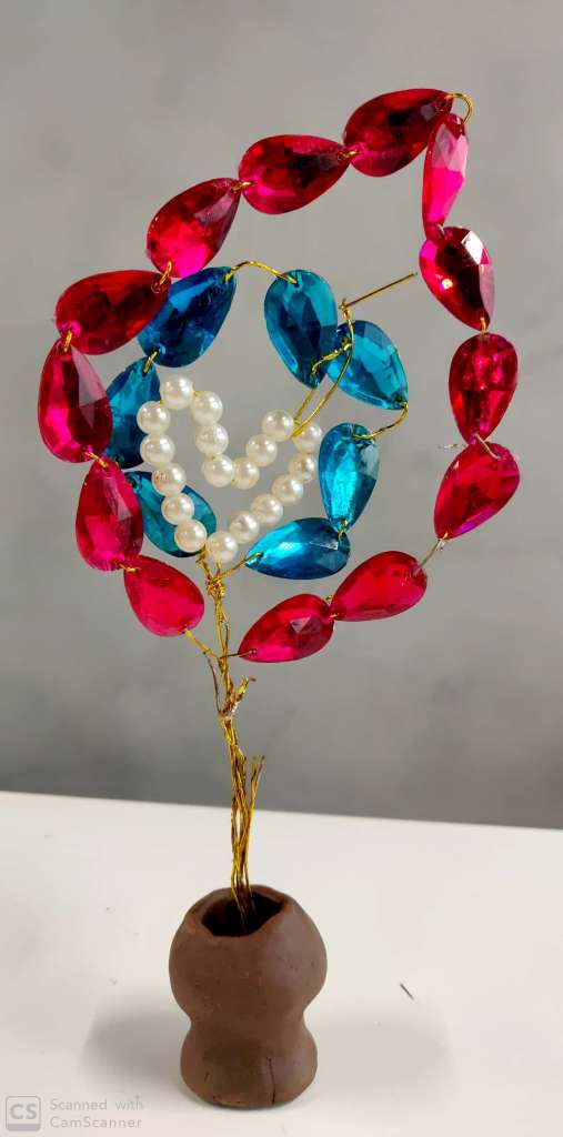 This is a pot and the feather.Then clay pot is the main hand fist which signifies someone holding a pen. The feather on top is just an add on to the abstract design.First the wires were shaped and each layers pearls and stones were woven into it . After the feather was ready the pot was moulded and shaped with objects. The clay had to be wet in order for the feather to stand inside it.The clay pot before the wired feather was baked in an OTG at 150 degree Celsius for 20 minutes on baking mode. Then it was cooled down and the feather was placed. First and aluminium bowl on which ceramic tile and a butter paper was placed , then the pot and again an aluminium vessel was placed. This whole process was done after researching which resulted in lesser cracks and a fine finish with the clay being firmer and dryer.