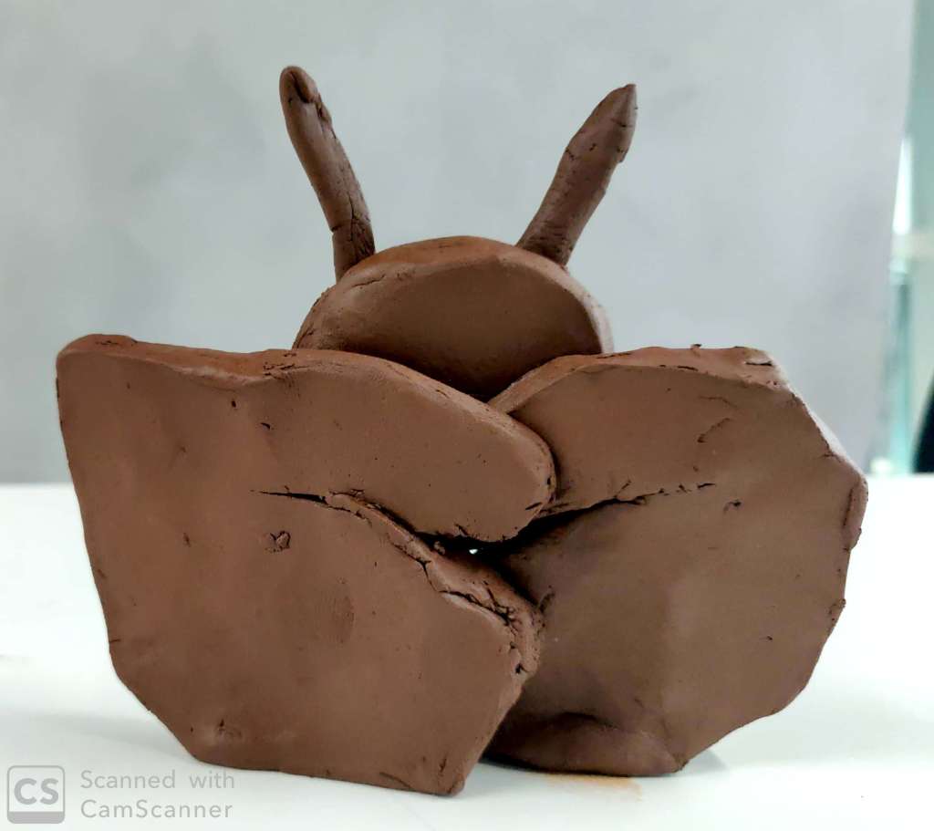 This is the same butterfly structure which previously created with wire and cloth now was experimented with Terracotta clay. This was made in three parts . Starting from wing which was dried and cut with a cutter in an accurate shape. Same with other wing. Then the head was moulded and cut giving this model a perfect 3 dimensional illusion.This prototype was a balanced shape which helped it to stand easily.