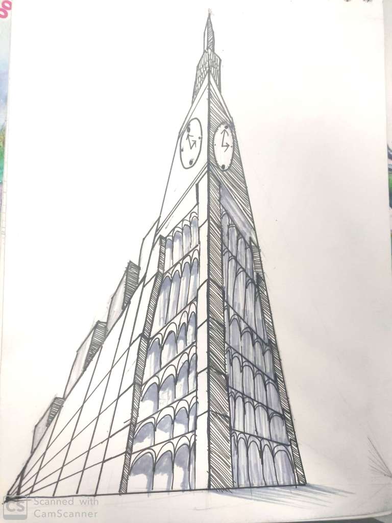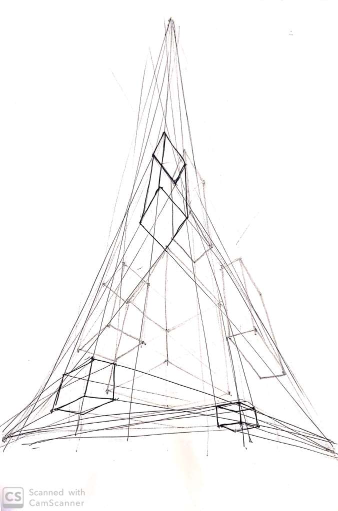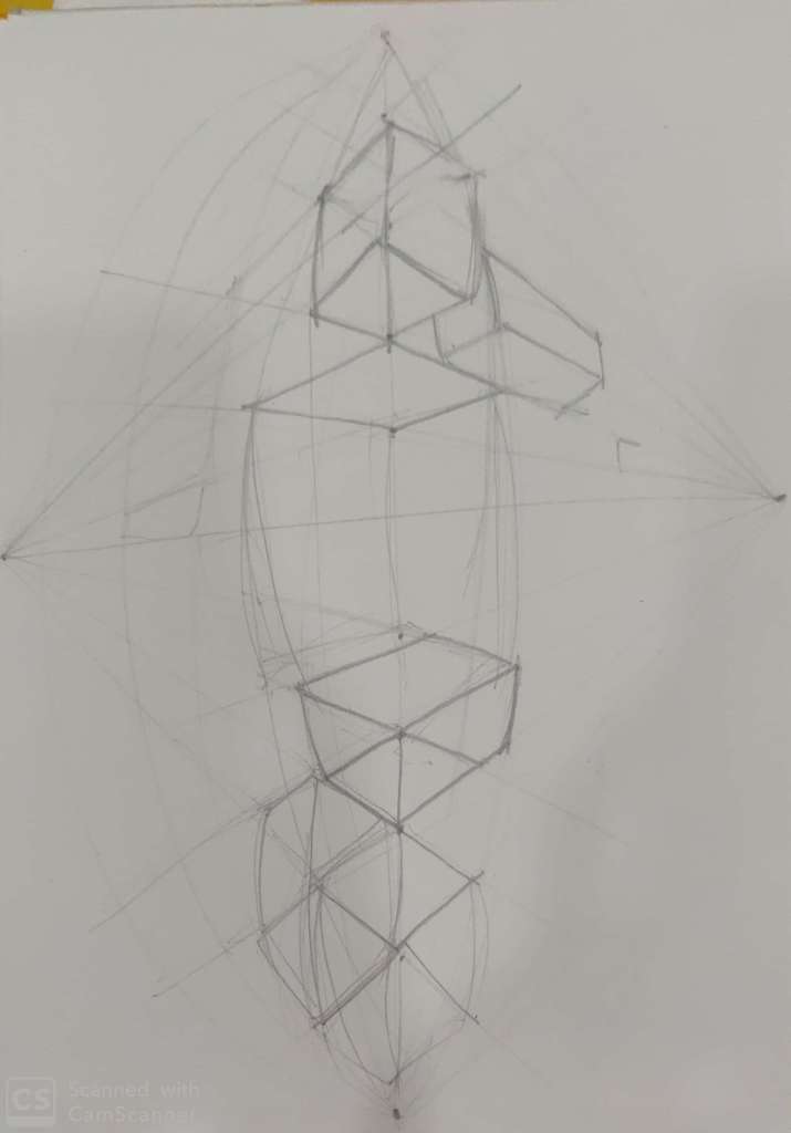 Today’s class commenced with reviewing our previous class assignment which was based on one and two perspective drawing.Where we started with constructing cubes and slowly and steadily moving on to compositions and structures . Today we understood the concept of three and four perspective drawing.Four point perspective is nothing but somewhere in middle which defines height and depth .In this also we started with cubes .So basic difference between all perspective are : one point requires a square to start with, two point requires a side , three point requires to create the side starting with forming a triangle and lastly four perspective requires a grid to identify the cuboid.