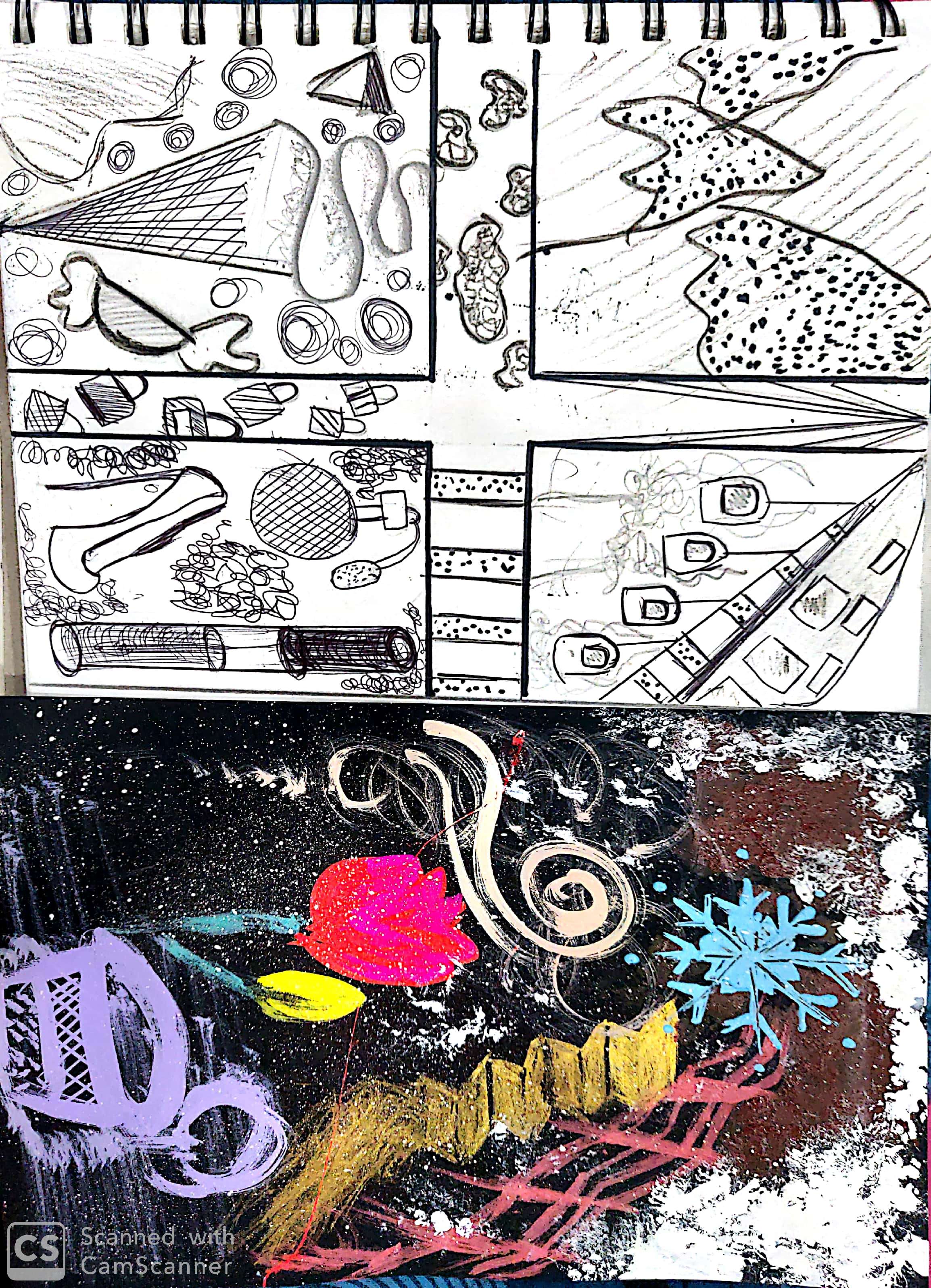 Towards the right side is the black page where we had to portray our experience through 5 senses.Touch, sight,taste,sound,smell.So by using poster and acrylic colors the beauty of the area is illustrated. Firstly,the purple bowl is a special cottage cheese yogurt which was the best taste.Next is a tulip flour sent flower which had an authentic smell which was unique and hard to find.With creamish white color is the symbol of wind . Being the peaceful city the only sound which was favorite to the ears was of cold breezy winds.Next is the magical staircase which is dreamy ‘beyond the clouds’ between mountain ranges was the best sight ever seen .Lastly , the symbol of snow flake and the snowfall in the background symbolizing the cold touch of snowball and playing with it was the best experience.This was an interesting part of the project reviving memories and painting them to fantasy.