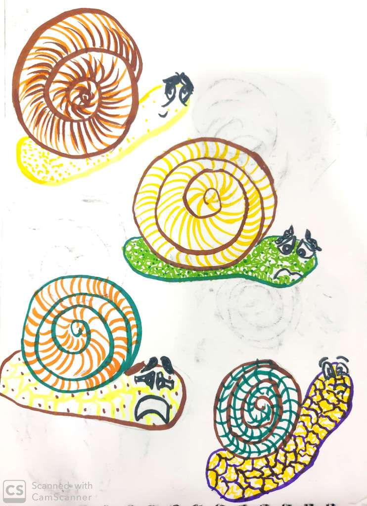Therefore i chose snail as my character and remorse, worry as a emotion. In this black pen ball and ink pen as the main medium through various rendering techniques we communicated the idea. Scribbling gave the ultimate texture and stippling also managed .