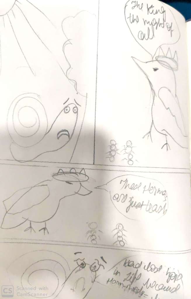 This is one side of the story board. Where my main character is snail who is sad and has low self esteem. The kingfisher is the king of the jungle having extremely greedy attitude .Two ants have been shown as the servant of the bird.