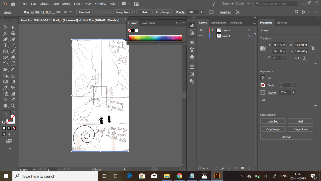 Today’s class was the actual part of starting the zine . I was only able to attend the second half due to extreme weather conditions . The class was about digitalizing the rough draft that we had created. So the main part was understanding how it is going to be formatted on real paper and accordingly start digitalizing it . So according to my format first on illustrator i started tracing the sketch work through pen tool . But the mistake i incurred at the first step was not setting the pen point size . I completed tracing the whole frame but no sooner i realized the lack of visibility . So to reconcile the mistake i started adding layers . Then the next obstacle i was facing was with the ants . It was very much difficult to trace tiny ants . Hence , zooming and copying them with the help of alt helped. So today’s class helped us revise the concepts of illustrator that we had been learning since the very start.It seemed difficult at start but as when we started understanding the logic and application of right tools it became very much easier.