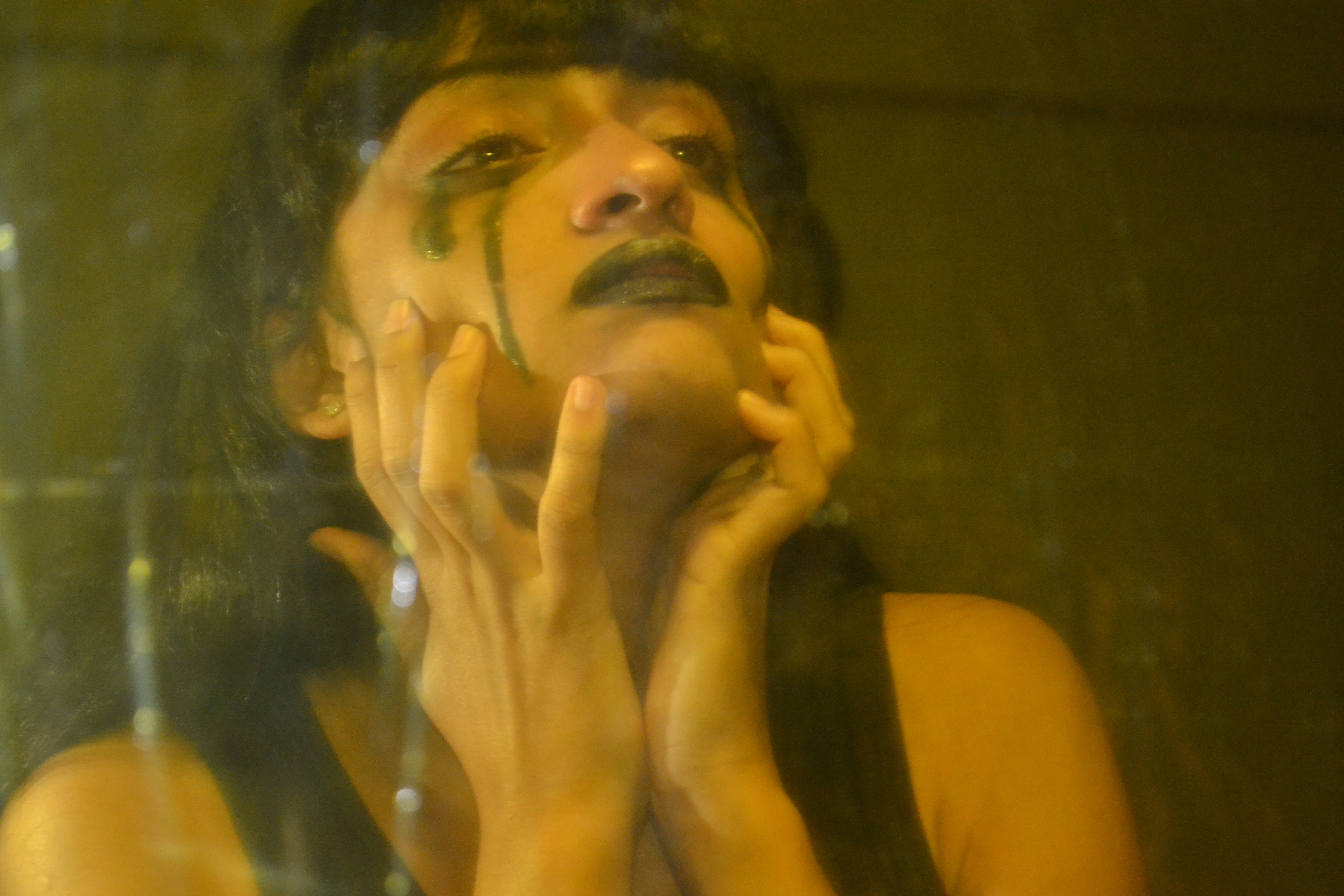 This the first photo of my narrative . It describes a miserable and confused girl . For the picture i used yellow gelatin paper on mirror as a effect of sadness . As color yellow is also a symbolic of depression.The makeup done is complete black makeup with dark lip and exaggereted tears emphasizing darkness. With the help of glitter the tear is given a realistic effect.