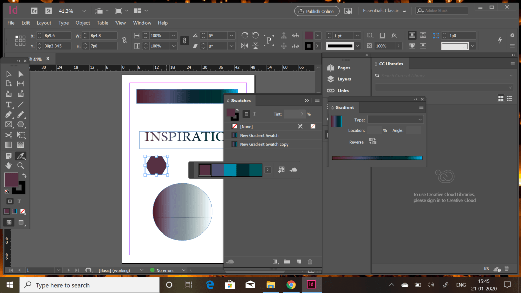 Today’s class i was absent . But later i attended an extra class to cover up and also discussed with my classmates and this is what i gathered from everything. So a new software was started caleed in design in adobe . So this is mainly for effective layout. Many tools were very similar that of illustrator and photoshop . The most amazing fact that i understood was the concept of bleed and slug while creating new documents. The most common thing to which i never really thought of . This concept is mainly used while printing . Where a certain space is always left on the paper edges in oder to print it . But bleed assures an edge to edge print by changing sizes of the paper . Slug is instructions around the paper for any specifications in printing. Then the gradient feather which seemed so smooth and calm . With transparency it created amazing effects. Eye dropper tool also very useful to fill in colors according to the theme going around.The others were the same typography , pen pencil tools etc. The layout which was very differentwhere we could see an overall book or project at the same time.