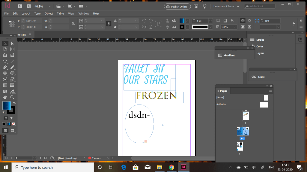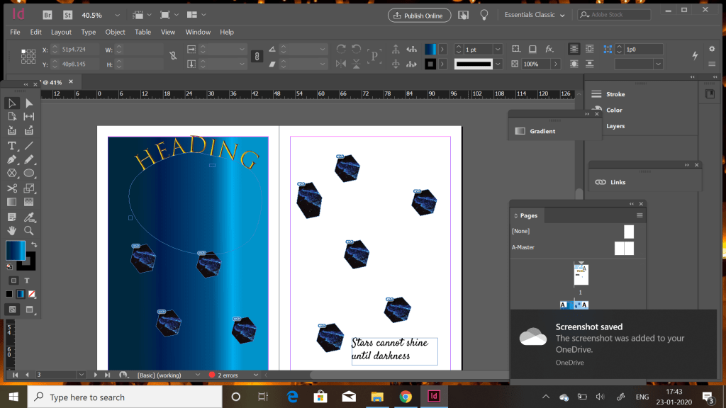 This is where i was trying out a theme and layout to match with . By using polygon frame where i arranged pictures of glowing water as my concept of stars cannot shine until darkness. By using type path tool i was exploring various ways to write heading.
