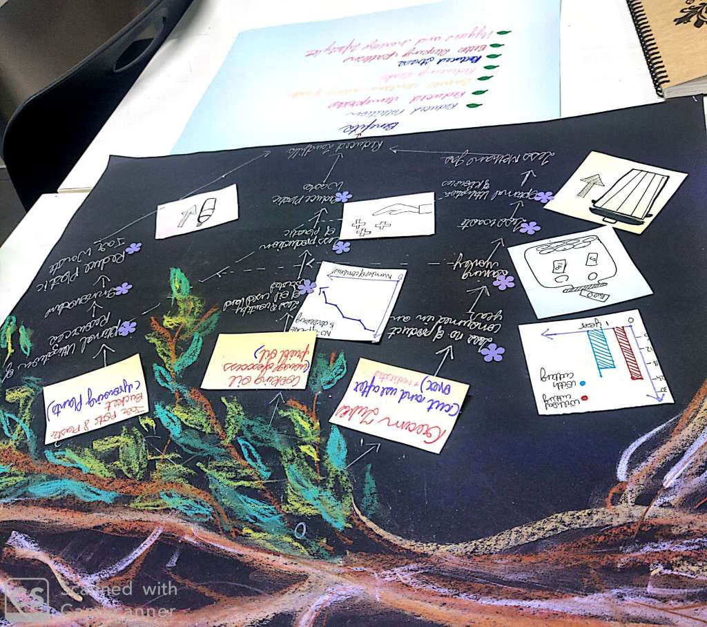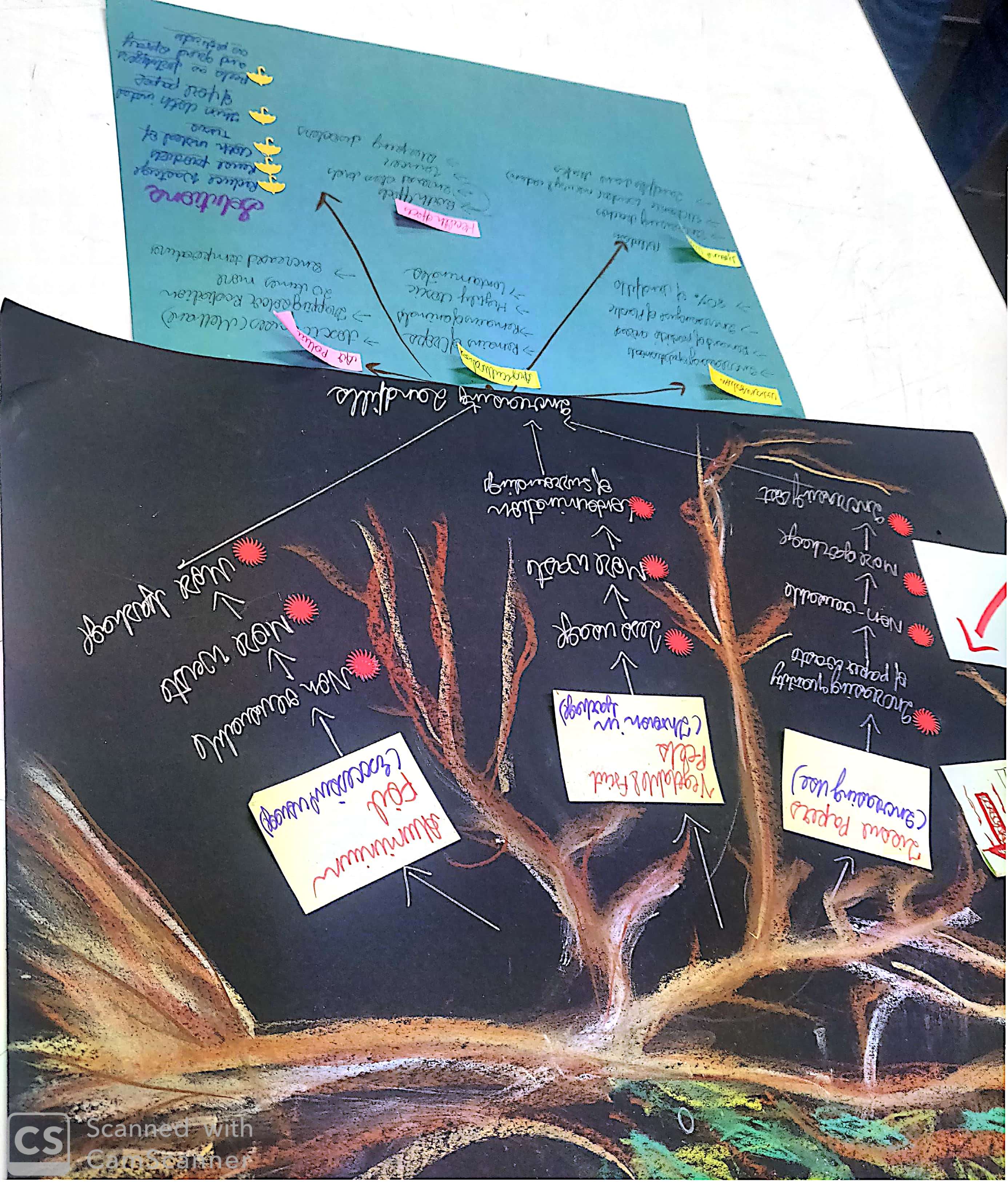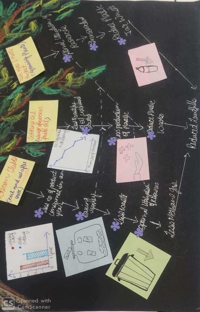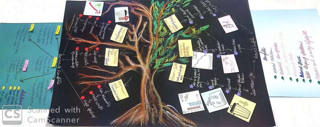This indeed taught the art of making mindmaps where i incuded graps , color coordination , punching shapes and to add the interactive visual point as a tree. The right side hasd purple flowers as positive soothing nature friendly. Benefits with leaf and on a blue clear water significance . Similarly on the left side we have the negative side as red color of danger seroous issue a sharp sun like shape signifying destruction . Similarly umbrella as soloution for saving our earth . This overall experience gave so much knowledge and learning which will surely help in any field .