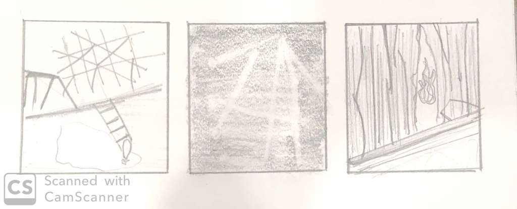 This is the city of Thekla which spike about many intricate structures and concepts with reference to the roman history . It was more like a construction site from planks to scaffoldings , wooden catwalks etc . The most highlighted concept for me was scafoldings, crack a fence and blue prints in the sky .First iteration where i connected different objects . Next was blueprints which i potrayed in a cinstellation form . Next was a crack in fence and which showed fire as hope which was spoken in the chapter.