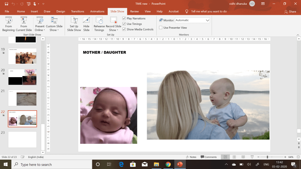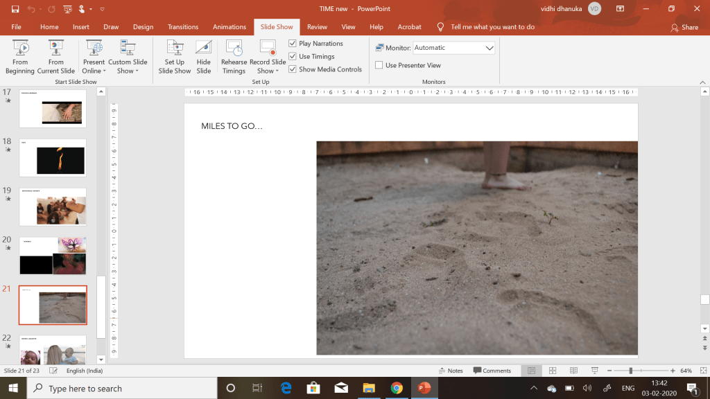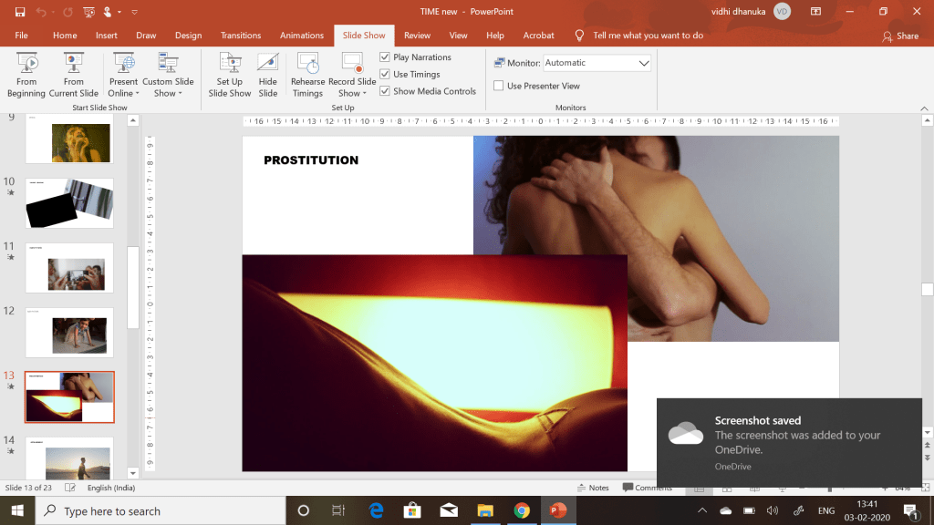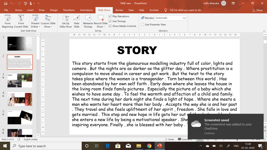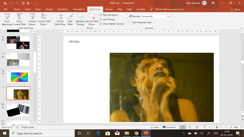 I presented my videos and ideas in a powerpoint presentation to have it in an organized way . At start it created misconceptions but was a sequenced and an easy to understant way format . I added various options for each style to give variety and a sense of exploration.Both metaphoric and literal ways were explored . My story spoke deep em otions and grave reality which i tried to potray with limited videos .Where through feedback also i learnt new ways and alterations which could be made on the basis of making it shorter and adding more connections to video for a sense of connectivity .