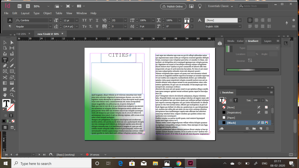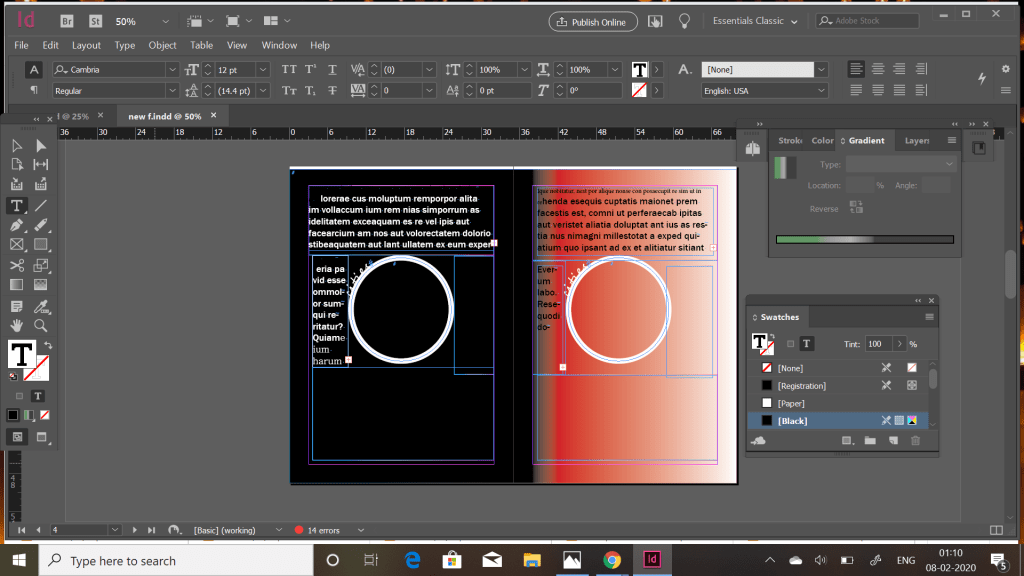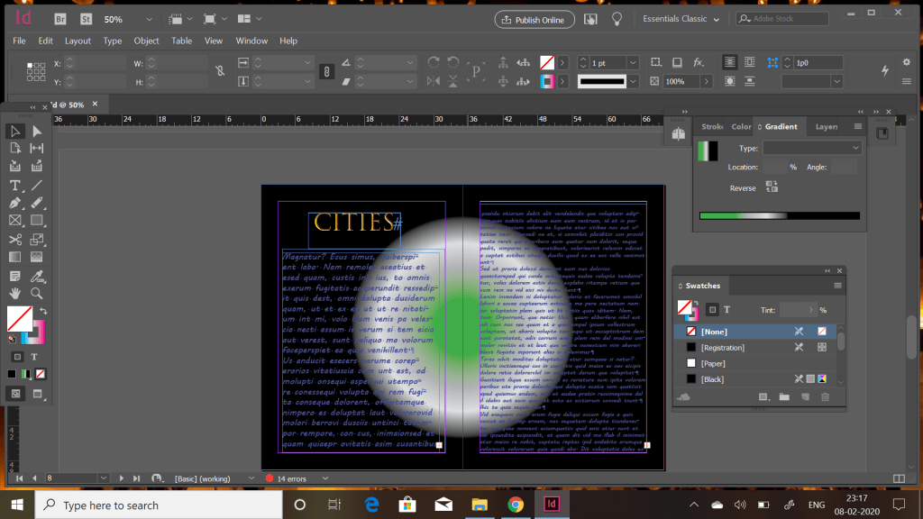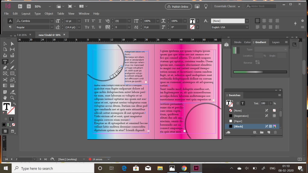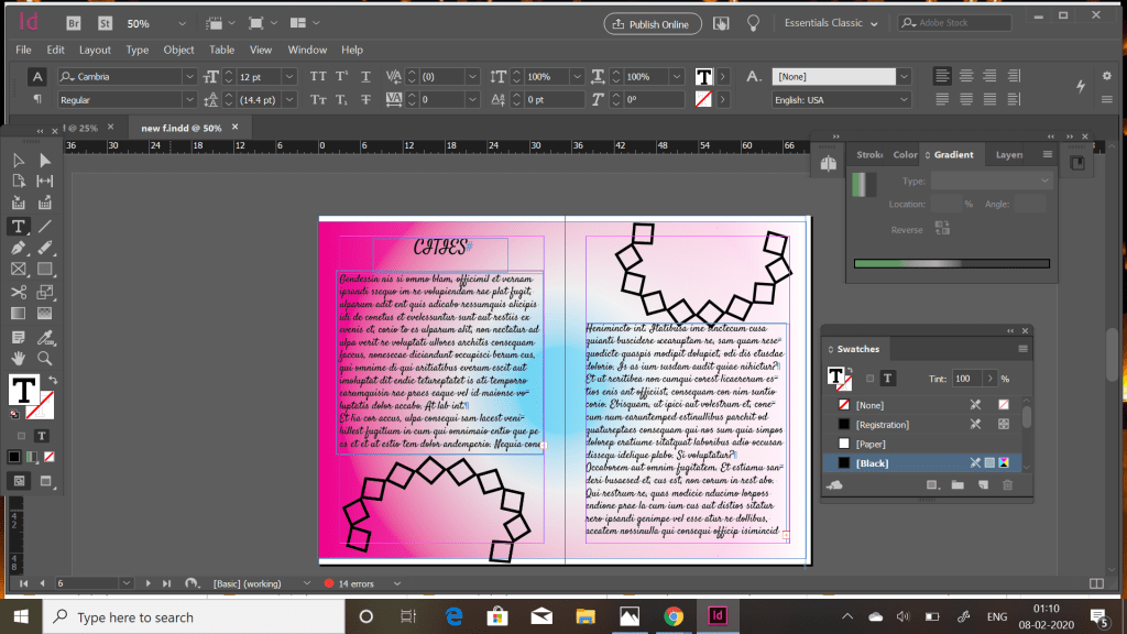 I used some already used patterns like this semi circle one . I used the unicorn colours and used a radical gradient . This is where the criss cross stroke was used to create the border . Being a 500 word essay maximum space is required hence i covered the maximum page. Black color for font suited the best as per colourful page .