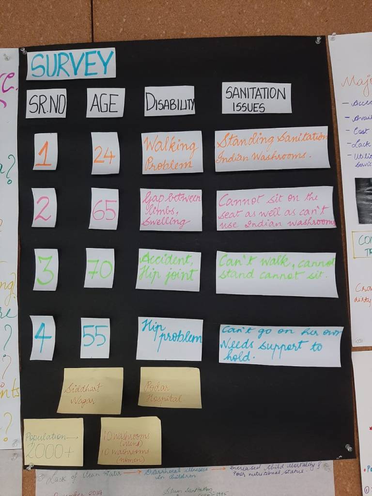 Therefore we visited a slum called siddharth nagar and podar hospital . The slum we visited had clean functioning washrooms but no special facility for the disabled . Then the public hospital also had residents from slum . Therefore we interviewed four people regarding their issues faced . Mainly our survey concluded to the need of having western washrooms . Washrooms being near by so it is easily accessible .