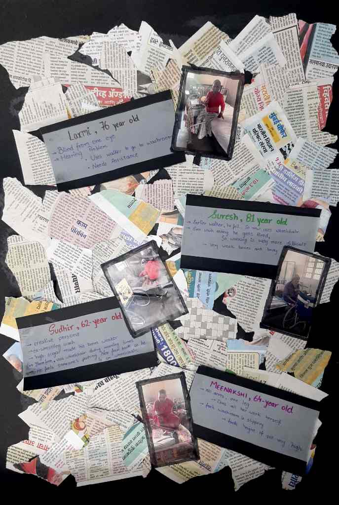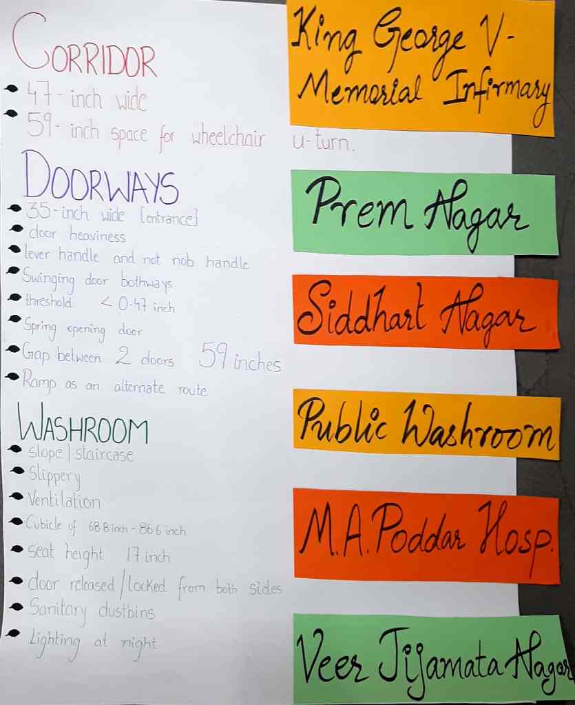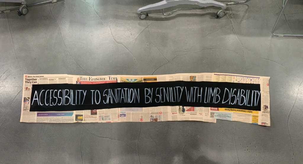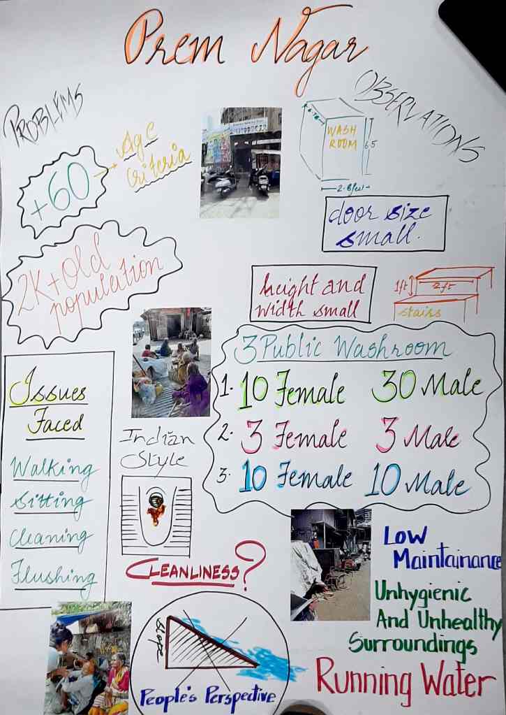 The start of our this step was first deconstructing the reviews from last class which were all mainly based upon narrowing down having it to the point . So we came up with our objective . Which was to the topic .”Accessibility to sanitation by senilty with limb disability .”So according we found people as per our research . The finds were very deep and intricate this time . As we had a detailed study on the washroom , entrance , corridor . This is where my learnings from remaging spaces came into the picture which was an elective last semester . It spoke about making spaces and things disabeled friendly . So the criterias which were created for the site visit in that class i collaborated them here to have an accurate and specific knowledge . This part drove us deeper into the reality of disabeled people surving in poverty . How entrance , ventilation and lack of light was a problem .
