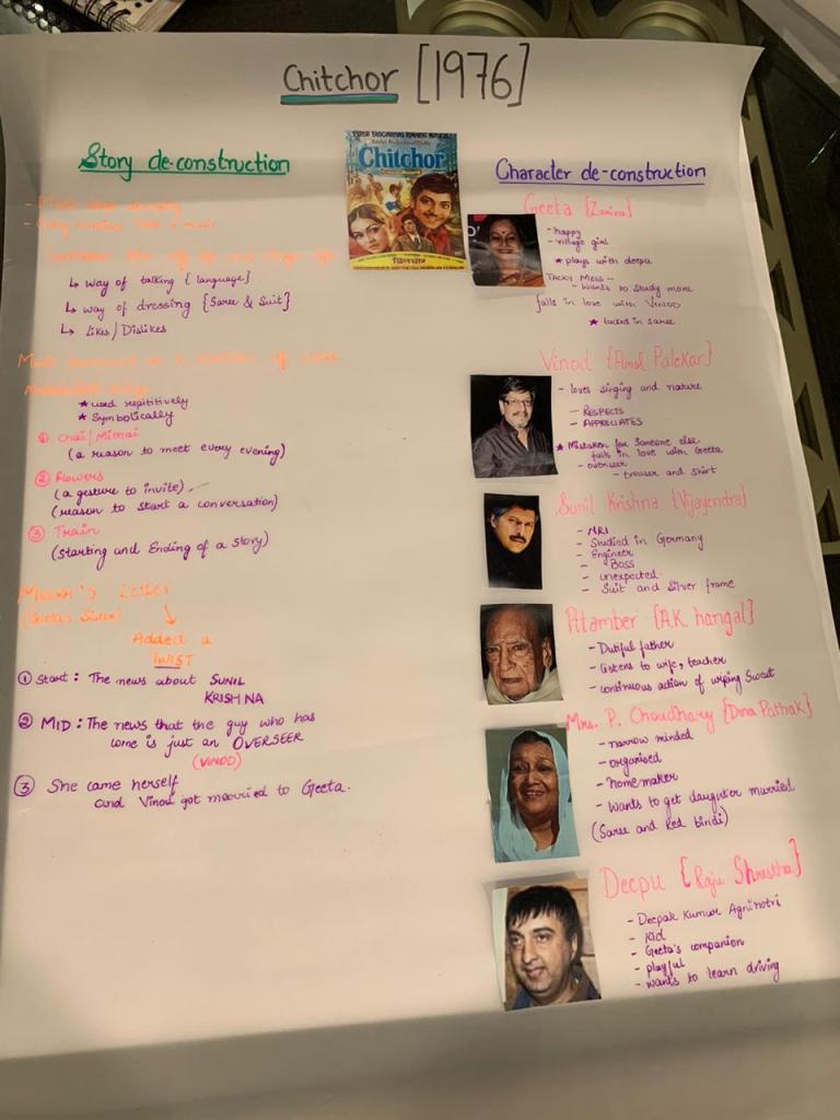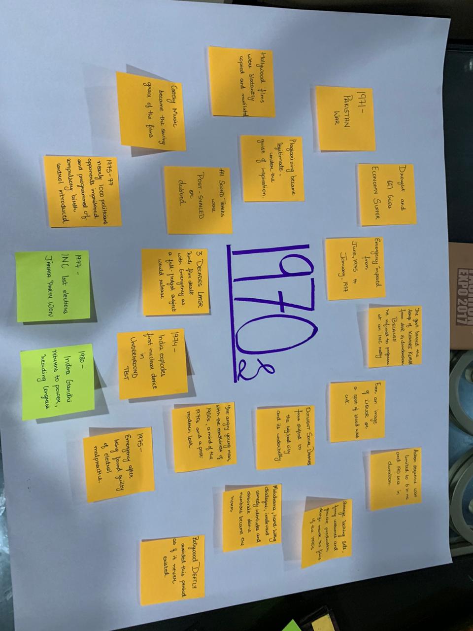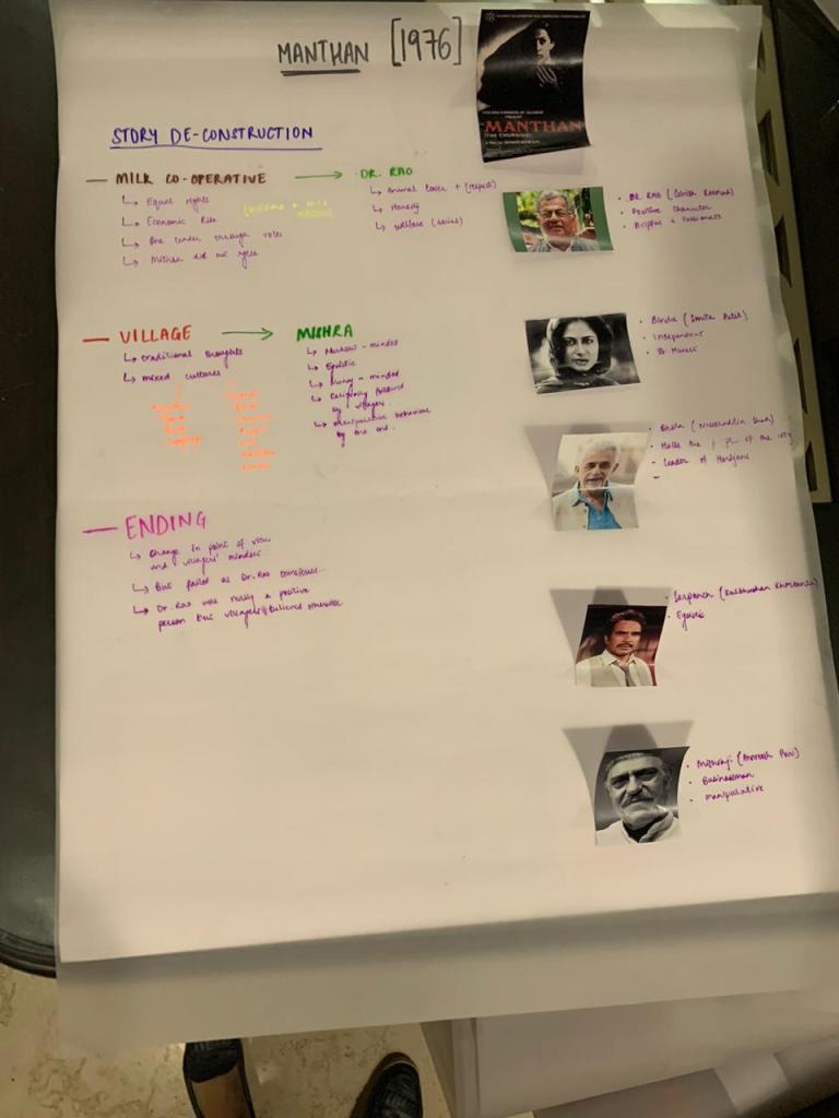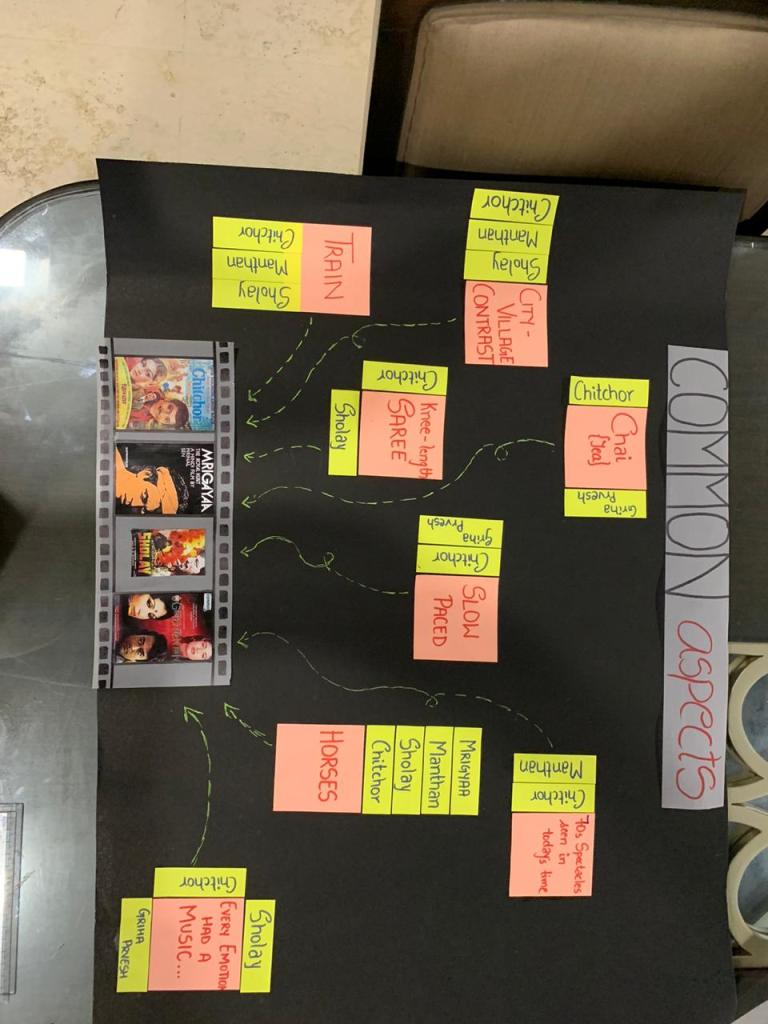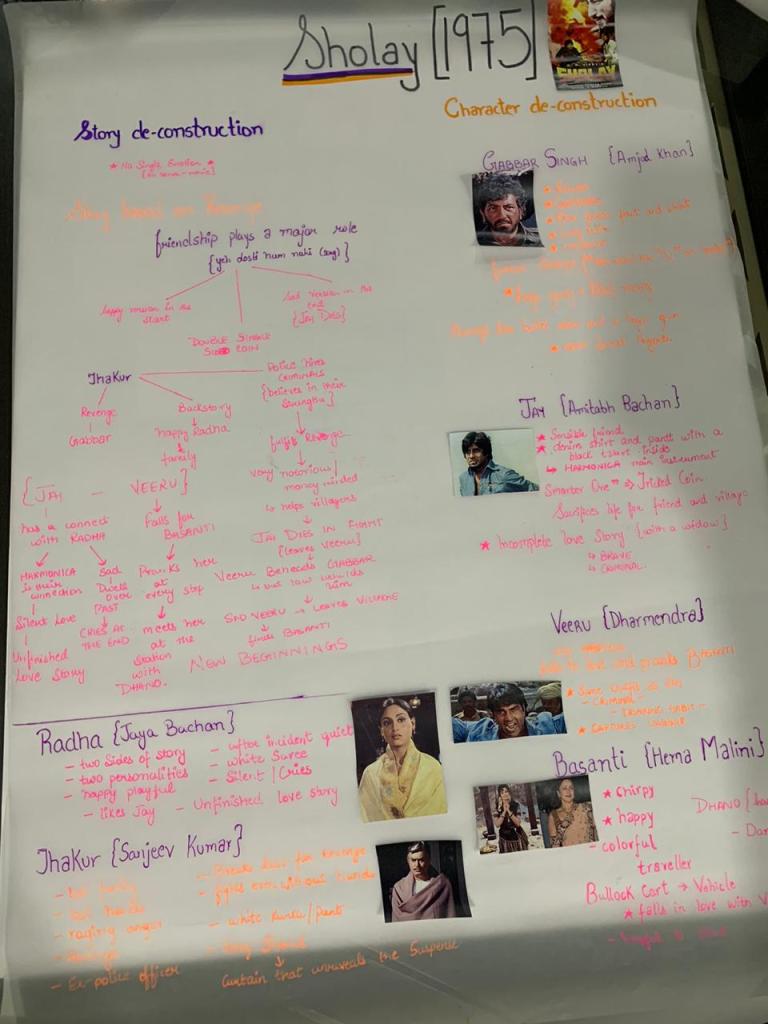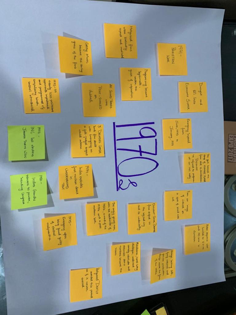 We even did a deep research on the era . It symbolized so many things . Especially politics and government intervention had a major effect on Indian cinema . This is where Emergecncy was announcec by Indira Gandhi . Then on the black chart we listed the common things we noticed in the movie until now . From trains , horses and many other things that remain very uniform in the movies . I specifically did a research on the movie sholay as it was districuted in the group . Many eyeopening facts were didcovered .